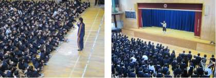 本校は新しい天井になった講堂で、分校はテレビ放送で、それぞれ2学期の終業式を行いました。