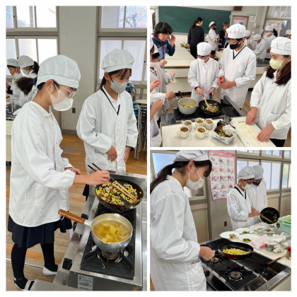 玉ねぎとコーンのコンソメスープ、ポテトサラダ、じゃがいもの揚げ焼き、野菜と竹輪の炒め物など、それぞれのグループで協力しながら調理を進めていました。