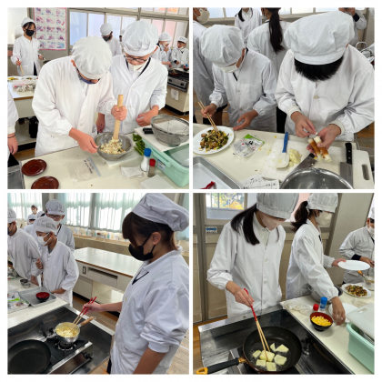 玉ねぎ、コーン、じゃがいも、ピーマン、竹輪、塩、コショウ、しょうゆ、コンソメ、サラダ油の決められた材料で、メニューはグループで考えて調理しました。