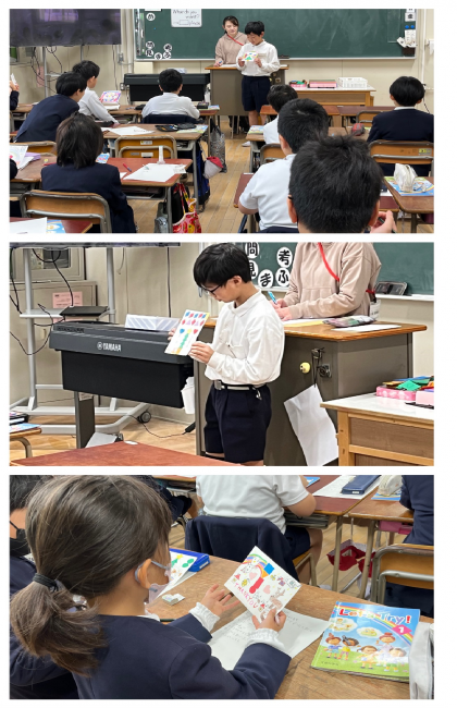 今日は、仕上がったグリーティングカードをみんなに紹介しました。色や形、数を英語で言ってから、こだわったところを発表しました。