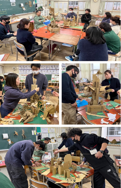 ダンボールを使った立体の授業です。実際に5年担任がやってみて、授業の改善点を話し合いました。