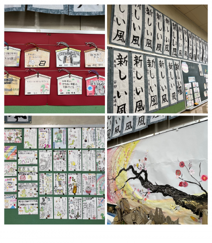 5年の教室を見ると、冬休みに取り組んだ書き初めやクラスの友だちに書いた年賀状、絵馬、梅の花などがていねいに掲示されていました。