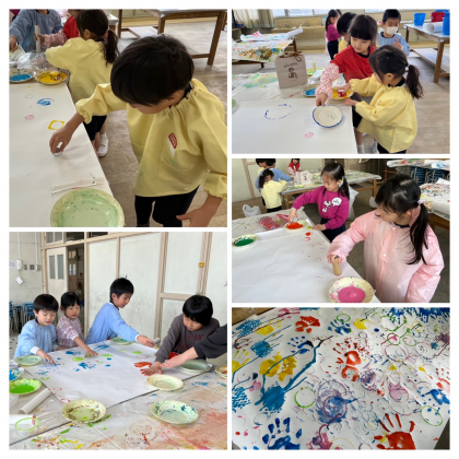 ラップの芯やペットボトルキャップ、手のひらに絵の具をつけて、子どもたちはどんどんスタンプをしていきました。友だちのスタンプの形や色を見て参考にしながら試し、楽しんで活動しました。