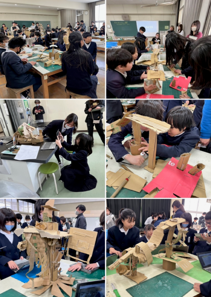 個人製作に向けて、班で協力しながら製作を進めました。友だちとの意見交流や班で一緒に製作を行うことで、友だちの意見を取り入れたり、自分の考えを共有したりすることのよさに気づくきっかけとなったと思います。