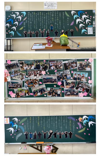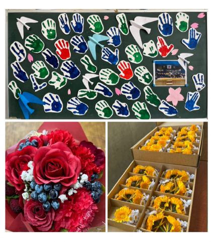 教室の黒板には、担任の先生からのメッセージが書かれていました。また、教室前廊下にはかわいらしい胸花がきれいに並んでいました。