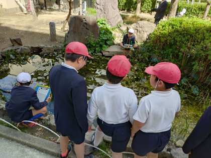 子ども達の中には「この小さいの花かな?」、「池になんもいないわ」などと言いながら観察していました。