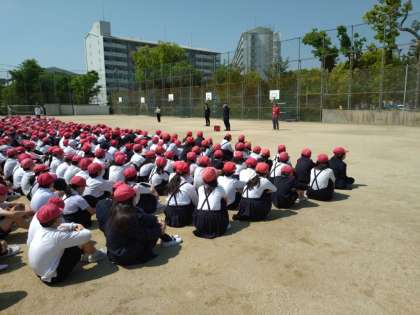 子どもたちは避難の後、校長先生よりハンカチを口に押えながら避難する意義や、消防隊員の方からは「お・は・し・も」の約束の話があり、子どもたちは自分の身は自分で守ることの大切さを学んでいました。