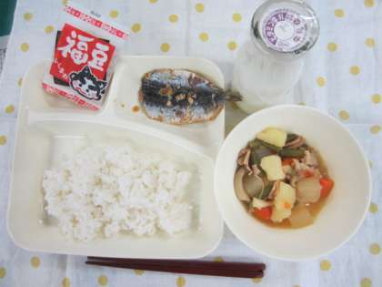 また、今日の給食は節分の行事献立で、いわしのしょうがじゅうゆかけ、含め煮、いり大豆、ごはん、牛乳でした。