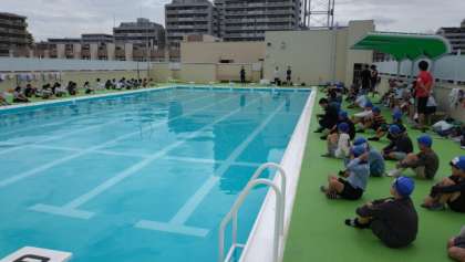 今日は近隣の水泳教室の指導者が、4年生児童を対象に「着衣水泳」の指導に来てくれました。
