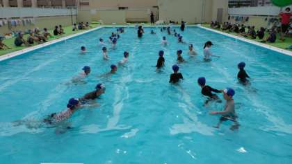 最初のシャワーでは、さっそく水を含んだ衣類の重さに戸惑いながらも、プールに入った後は底を蹴って進んだり、大の字になって浮いたりと指導者のお手本を参考にしながら要領よく学んでいました。