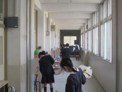 5年生の子どもたちは講堂の中や廊下・階段を掃除し、長椅子を縦横そろえ、きれいに並べていました。