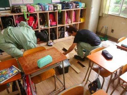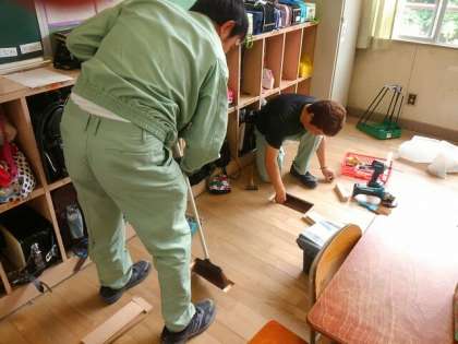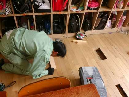 管理作業員が、痛んでいる床の補修をしていました。担任から、子どもたちがけがをするかもと相談され、子どもたちが音楽室で学習している1時間内に何とか補修をと、急ピッチで作業していました。