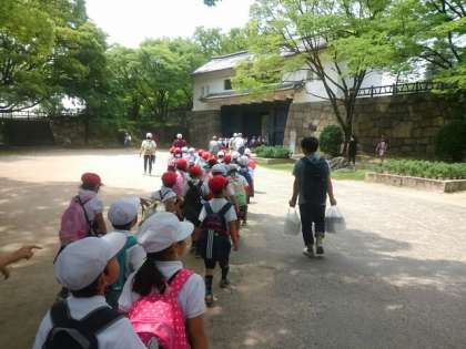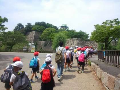 大阪城天守閣の大きさに驚いています。あの大きい石をどうやって積んだの?というつぶやきも聞こえました。
