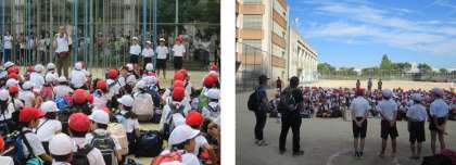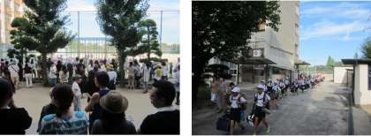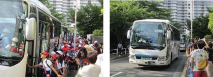 いい天気の中、5年生がハチ高原での2泊3日の林間学習に出発しました。7時頃には、大きな荷物を持ち、わくわくしながら登校してきました。運動場で林間学習の出発式をし、7時40分、たくさんの人に見送られ元気よく出発しました。
