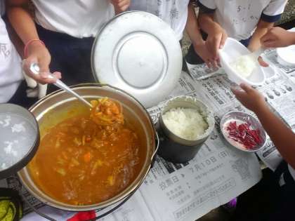 かまどに火をおこすだけでも煙が目にしみ、ひと苦労でした。でもグループで協力して、なんとかカレーができあがりました。