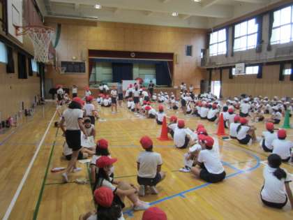 雨のために運動場が使えないので、体育館の中で運動会の練習をしました。