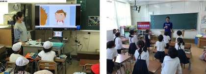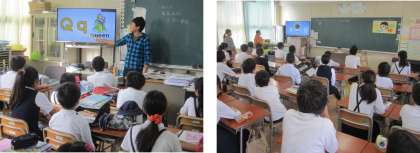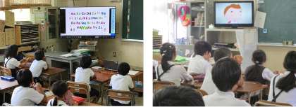 新学習指導要領(平成32年度実施)では、小学校3年生から外国語活動の時間が導入される方向が示されています。大阪市では、新学習指導要領への円滑な移行を促すとともに、これまでの成果をいかし、子どもたちが英語に触れる機会をより広げ、英語を積極的に学ぼうとする態度をさらに育成するため、音声を重視した英語教育を小学校低学年から実施する方針を打ち出しています。そこで友渕小学校でも「小学校低学年からの英語教育」を推進していきます。全学年とも毎週水曜日、8時35分から8時50分の間、視聴覚教材を中心に音声を重視した短時間学習の英語教育が本日よりスタートしました。子どもたちは大型テレビでDVDを見ながら楽しそうに英語学習に取り組んでいました。