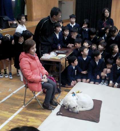 子どもたちが驚いたことの一つに、盲導犬にとって、もっとも難しいことが「待つ」ということだということです。さぼっているのでは思っていたら、実は、じっと、ご主人様の側で座ってまつという仕事をしていると知って、「かしこいなあ」というつぶやきがあちことから聞こえました。