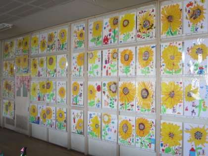1年生は「ひまわり」「おしゃれなきょうりゅう」「すてきなぼうし」の作品を展示しています。自分の思いをのびのびと表現しています。