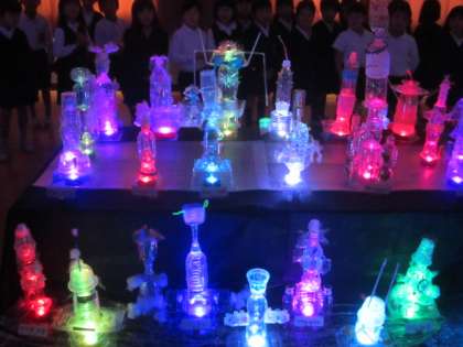 3年生は「ふしぎな木」「クリスタルファンタジー」の作品を展示しています。パスを重ね塗りし、引っかいて木を描いたり、光を通す材料の組み合わせを工夫して表現しました。