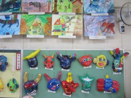 5年生は「祭りのお面」「不思議な世界」の作品を展示しました。