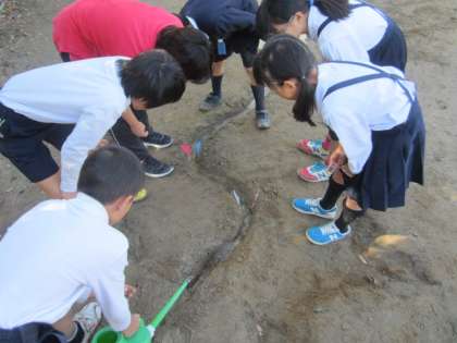 運動場の土山に溝を作って川にし、上から水を流して流れる水とはたらきついて実験をしました。水のはたらきで、川が曲がっている内側や外側の様子を興味深く観察していました。