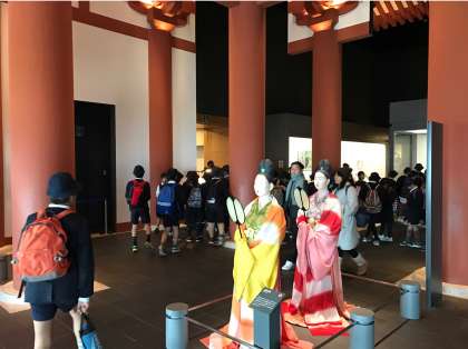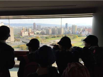 まず、歴史博物館の10階から奈良時代の難波宮の大極殿のようすを見学し、窓からは難波宮跡や大阪の街並みのようすを見たりしていました。