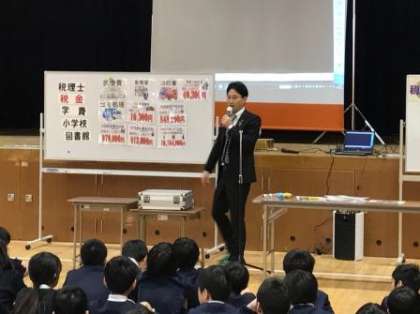 中でも、小学校でかかる費用に使われている税金は、小学生一人あたり年間約85万円にもなること、そして、小学校1年生から高校3年生までの12年間で考えると、一人当たりに使われる税金は約1070万円にもなると知り、子どもたちからは驚きの声があがっていました。税理士さんから、「これだけの税金を使って勉強させてもらっているのだから、しっかり頑張らなければだめですね」という話に、大きくうなずいていました。