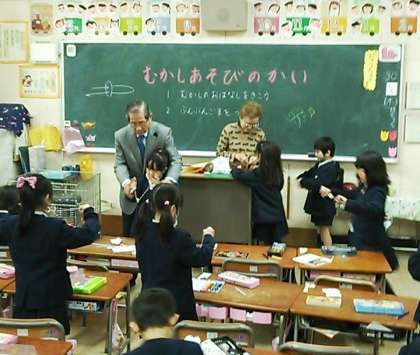 1年生では、今日は友渕老人クラブ連合会から17名の方をお招きして、子どもたちに昔の暮らしのお話をしていただいたり、昔あそびを教えていただいたり、一緒に作って遊んだりする学習を行いました。