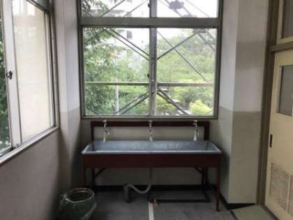 新校舎棟が完成すると、既設棟との通路は東側校舎の手洗い場とエレベーターホールの2か所に渡り廊下が設置されます。そのため、工事が終わるまで手洗い場が使えなくなるのはとても困るので、急遽、仮設手洗い場を各階に2か所設置していただきました。
