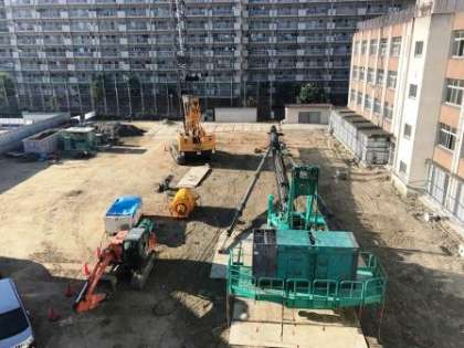 一昨日の朝までは、ほぼさら地だった工事区画内ですが、この2日間であれよあれよと言う間に、大型重機が搬入され、組み立てられていきました。