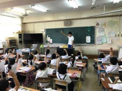 まずは、漢字を学習する際の、机の上のマスターノートや筆箱の基本的な置き方を教えてもらいました。1つめに学習する字は、「山」。元気よく手を出して、先生に合わせて“空書き”をし、筆順を覚えたり、ノートに練習したりしていました。