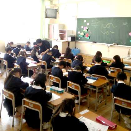 今まで、少しざわざわしていた子どもたちも、鉛筆をもってプリントに向かうと勉強らしく思うのか、物音ひとつ立てず、集中して真剣に机に向かっています。その姿に、太田先生もびっくりです。