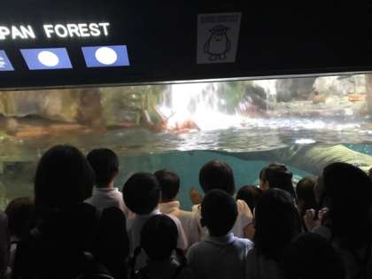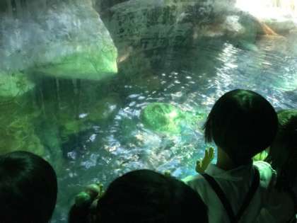 「日本の森」のカワウソ、「モンターレ湾」のラッコの愛らしさに見入っています。いつまでも見てたらおいてかれるよと、注意される子も。