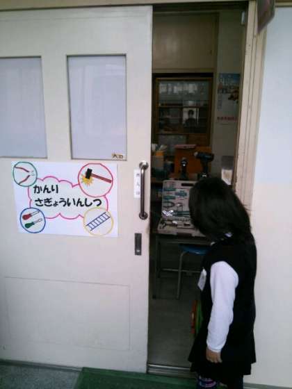 1年生にとって初めて見る2年生や3年生の教室・管理作業員室・放送室そして職員室など中のようすも見学しました。1年生は初めて見た部屋で2年生の説明を聞きながら興味深く見ていました。