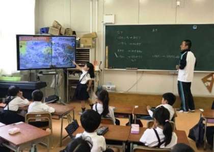先生が大きなテレビに写してくれた教科書の絵図から、秋を感じるものを見つけます。前に出てきてお友達にわかるように発表できるようにもなりました。