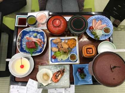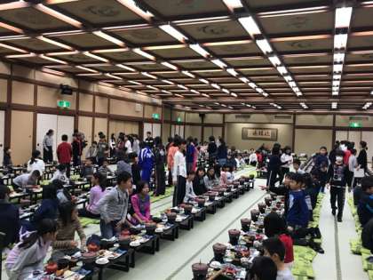 お楽しみの夕食です。ご馳走を前に、みんなが揃うのを待っています。