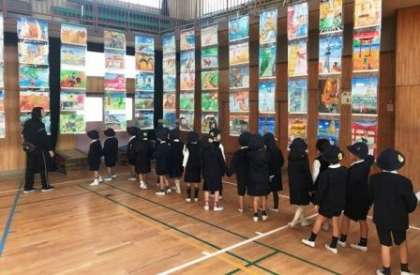 昨日から始まった作品展。今日は、低学年の子どもたちは本校に、高学年の子どもたちは分校に行き、互いの作品を相互に鑑賞する時間をとりました。低学年の子どもたちは、お姉さん、お兄さんの迫力ある作品に感嘆の声をあげ見ていました。高学年の子どもたちは、自分もこんな絵を描いて(工作をして)いたなあと、懐かしそうに眺めていました。