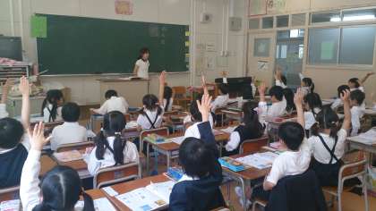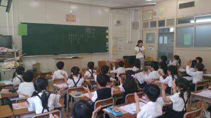 ※ 写真は、昨日の1−8組の授業の様子です。あれ?担任の立花先生はと思われる方もあるかもしれません。1年生では、担任の先生がメインで授業をしますが。少人数担当の折部先生がサブで入り、子どもたちの間を回りながら個別指導をしているのですが、今日は役割を交代し、折部先生がメインの指導を、立花先生がサブの補助指導をしていました。