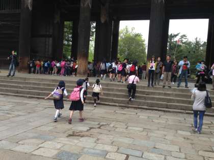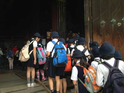 雨の心配をしていましたが、何とか雨にも降られず6年生は奈良公園へ遠足に行きました。初めは歴史学習に関係する東大寺大仏殿で大仏を見学しました。