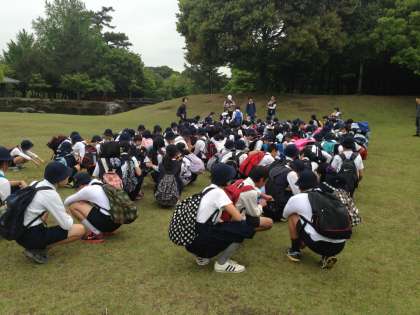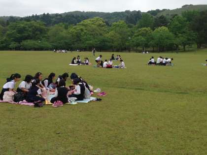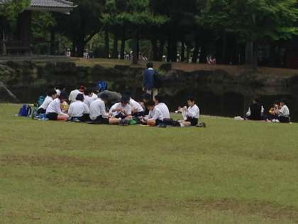 奈良公園の芝生の上で楽しみのお弁当タイムです。友達と一緒に食べるお弁当はとてもおいしそうです。