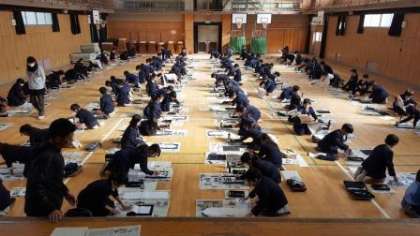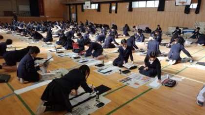 普段とは違って、床に半紙をひろげての清書。昔ながらの「席書会」の雰囲気を味わいながら、一人一人が自分の思いを込めて、書き初めをしました。