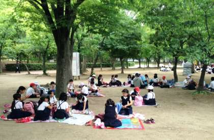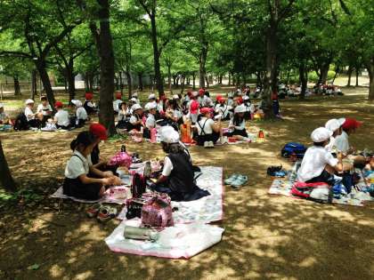 お楽しみお弁当&おやつタイムです。長居公園は木陰がいっぱいあるのですずしくていいですね。