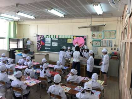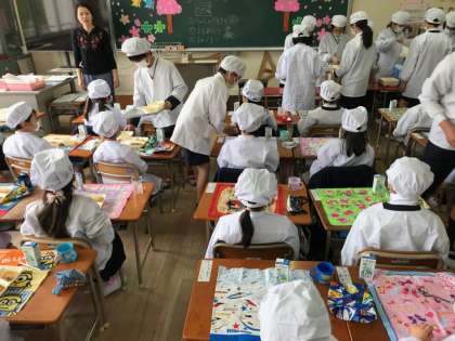 今年からの取り組みですが、6年生はすばやく給食衣に着替え、さっそく準備に取り掛かります。