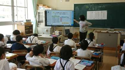 友渕小学校では、授業用PCや大型テレビ、デジタル教科書などのICTを活用した授業が日常的に行われています。視覚的に物事をとらえ、児童が総合的に活用する能力を育成する一助となっています。