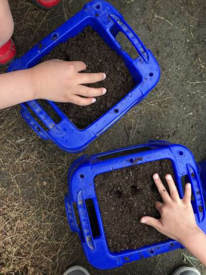 自分の鉢に土や腐葉土を入れ、指で穴をあけて種を植えました。