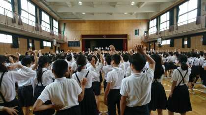 シンプルなルールだけに、誰もが楽しめるゲームです。時折、紛らわしい命令も出されて、講堂には笑いが起きていました。