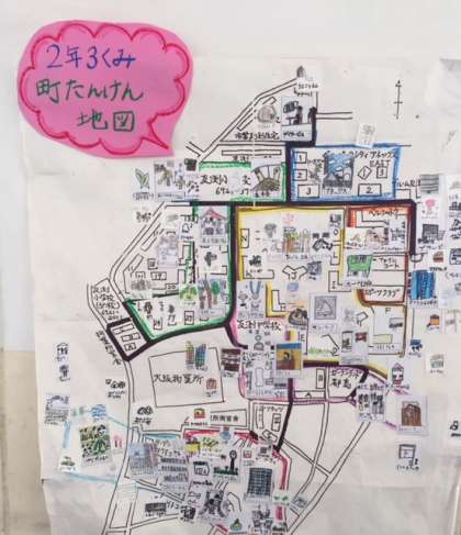子どもたちが「町たんけん」のあとに作った地図です。子どもたちの気づきが散りばめられた、楽しい地図に仕上がりました。