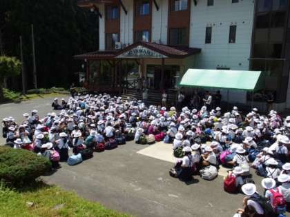 みやま荘に到着。気温は手元の温度計で28度です。晴れている場所は暑いので、お弁当は各部屋で食べることにします。