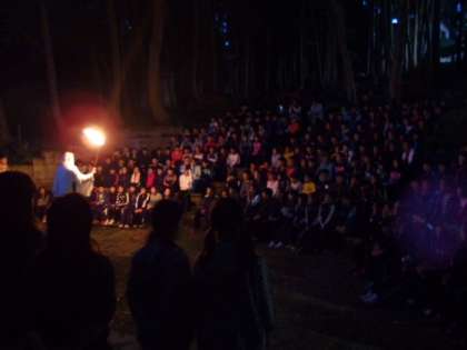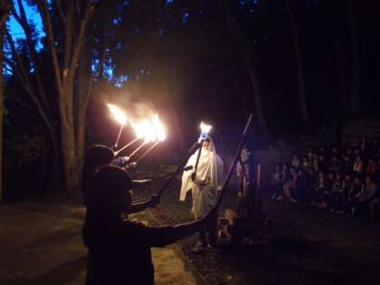 夜の行事は、キャンプファイアーです。火の神様が子どもたちに友情・希望・優しさ・学び・努力・感謝・命の7つの炎を与え、その与えられた炎で子どもたちが点火します。